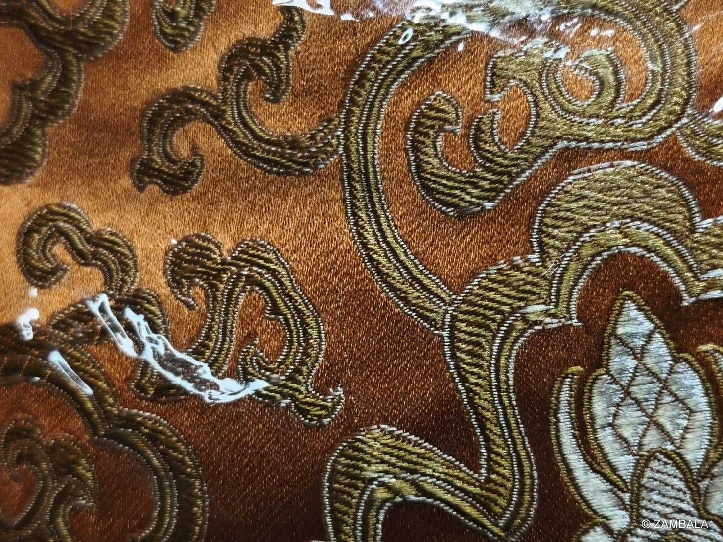 - Large monasteries' scriptures: Yellow satin, red satin, or gold-woven satin, embroidered with mandalas, the Eight Auspicious Symbols, and the Seven Treasures.