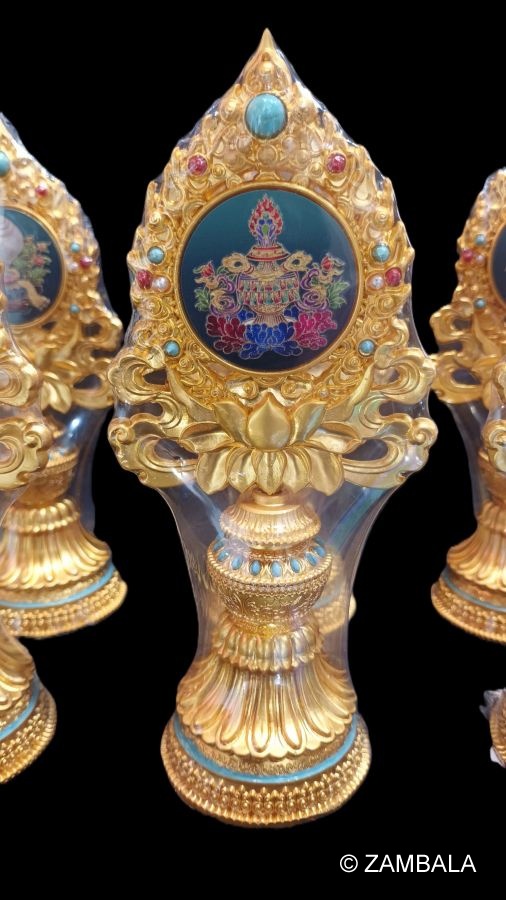 4. **Treasure bottle** (བུམ་པ་): It symbolizes the perfection of wisdom and blessings, and represents that practitioners can obtain endless Dharma wealth and blessings.
