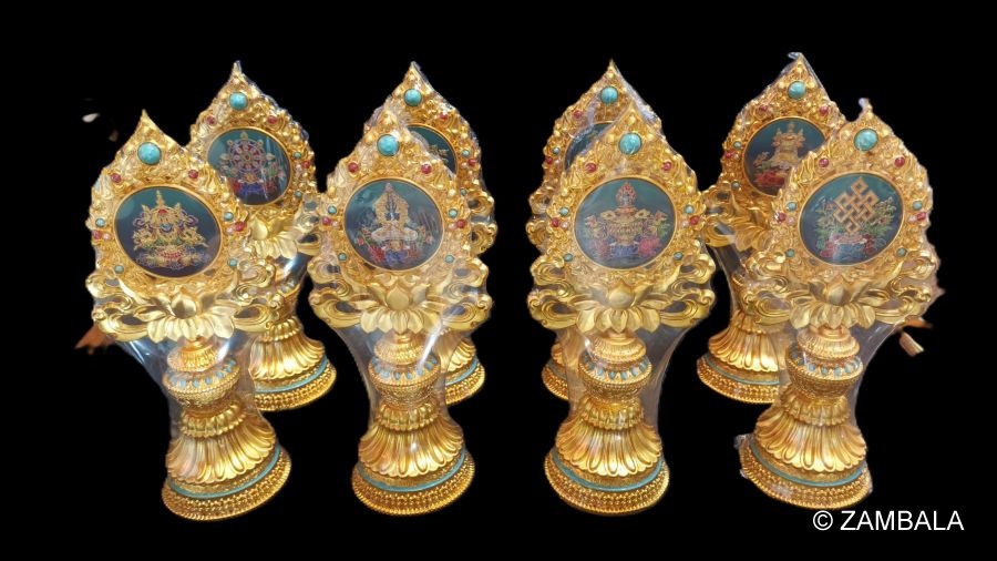 In Tibetan Buddhism, the **Eight Auspicious Dharma Pagodas** (བརྒྱད་བཀྲ་ཤིས་) are eight instruments that symbolize auspiciousness and perfection, representing the excellence of Buddhism and the perfection of practice. The eight mascots are: