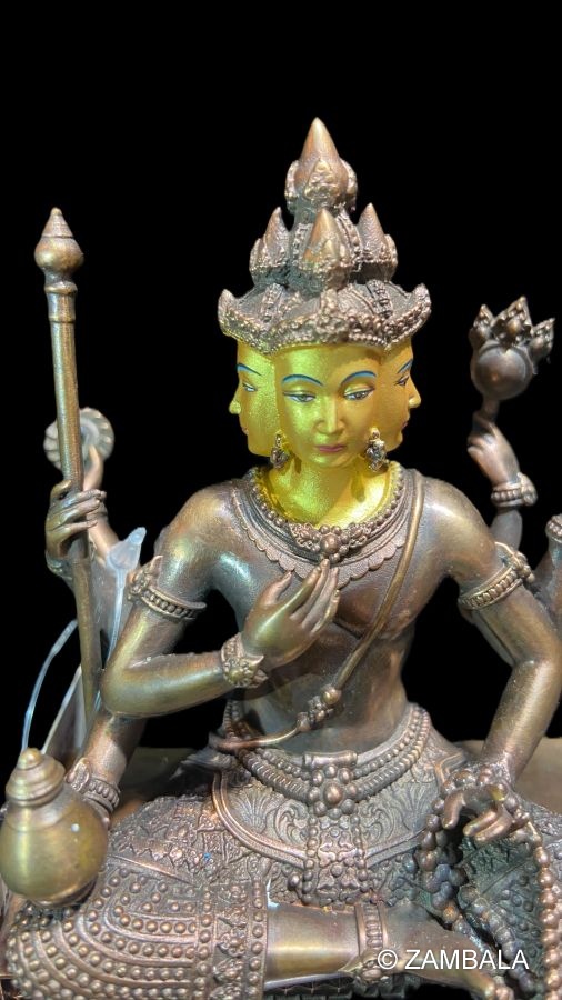 | Material: Bronze. Gilded face. Cast.Size: 12 cmDescription:The Four-Faced Buddha (Brahma) holds a different position of influence in Tibetan Buddhism than in Hinduism, and its role and usage are influenced by specific cultural and religious contexts within Tibetan Buddhism. The following is a detailed description of the Four-Faced Buddha's position, usage, and origins in Tibetan Buddhism: I. The Four-Faced Buddha's Influence in Tibetan Buddhism1. **Minor Role**:- In Tibetan Buddhism, the Four-Faced Buddha (often called "Tshangs-pa" in Tibetan) is not a central figure of worship, but rather appears as a guardian deity or a minor deity. Tibetan Buddhism primarily focuses on the Buddha, Bodhisattvas (such as Guanyin, Manjushri, and Tara), and other Tantric deities, while the Four-Faced Buddha holds a relatively low status. The Four-Faced Buddha is often considered a Dharma protector (lokapāla). Along with other Hindu deities such as Vishnu and Shiva, he is incorporated into Tibetan Buddhist cosmology as a "worldly deity" that protects the Dharma. 2. **Cosmic Symbolism and Protective Function**:- In Tibetan Buddhism, the Four-Faced Buddha is considered the Emperor of the Desire Realm Heaven (one of the presiding deities of Indra), residing at the summit of the Desire Realm Heaven, the Akanishta Heaven. His four faces symbolize his observation of the four directions of the universe, representing omniscience and authority.- As a Dharma protector, the Four-Faced Buddha's function is to protect the Dharma and remove obstacles. He is also invoked in certain rituals to enhance the merits of practitioners or protect the environment for practice. 3. **Symbolism of Cultural Fusion**:- Tibetan Buddhism absorbed many elements of Hinduism, and the image and function of the Four-Faced Buddha are the result of this fusion. His transformation from a Hindu creator god to a minor deity in Tibetan Buddhism embodies the Buddhist transformation and absorption of Hindu deities. II. The Use of the Four-Faced Buddha in Tibetan Buddhism1. **Rituals and Prayers**:- The Four-Faced Buddha often appears in certain Tibetan Buddhist ceremonies or offering rituals. For example, during the practice of certain tantric practices, offerings are made to the Four-Faced Buddha and other Dharma protectors to pray for success, increased wealth, or the removal of obstacles.- In temples or mandalas, the image of the Four-Faced Buddha sometimes appears on murals or thangkas as one of the Dharma protectors, guarding the four directions. 2. **Thangkas and Statues**:- The image of the Four-Faced Buddha in Tibetan Buddhist art typically retains the four-faced, four-armed characteristics of Hinduism. The four faces of the head face the four directions, symbolizing omniscience; the four arms hold various instruments (such as the Dharma wheel, lotus, and scriptures), symbolizing creativity and wisdom.- These images often appear in secondary locations, such as the periphery of the mandala or within the Dharma protector hall of a temple, rather than as primary objects of worship. 3. Mantras and Tantric Practices:- In some Tantric rituals, mantras or prayers associated with the Four-Faced Buddha may be recited, but these mantras are usually intended to invoke his protective power rather than to directly worship him as the main deity.- For example, during the practice of wealth tantras or certain karma practices, the Four-Faced Buddha may be viewed as a supporting deity to enhance one's endeavors. III. The Origin of the Four-Faced Buddha in Tibetan Buddhism1. Derived from Hinduism:- The Four-Faced Buddha originated from Hinduism as one of the Trimurti, responsible for the creation of the universe. In Hinduism, he is one of the supreme deities, alongside Vishnu (the God of Preservation) and Shiva (the God of Destruction).- With the spread of Buddhism from India to Tibet, many Hindu deities were incorporated into the Buddhist system, but their status was redefined. The Four-Faced Buddha's role shifted from a creator deity to a protector deity, subordinate to the teachings of the Buddha and Bodhisattvas. 2. **Indigenization of Tibetan Buddhism**:- When Tibetan Buddhism was introduced to Tibet by Padmasambhava and others in the 7th and 8th centuries, it incorporated elements of local Bon and Hinduism. The image and function of the Four-Faced Buddha were incorporated into the Tibetan Buddhist cosmology and combined with the functions of certain Bon deities.- In the Tantric system of Tibetan Buddhism, the image of the Four-Faced Buddha was given new symbolic meaning, becoming one of the protectors of the Dharma rather than an independent deity. 3. **Documentation and Legend**:- In Tibetan Buddhist texts (such as certain tantras in the Tripitaka), the Four-Faced Buddha is mentioned as the king of the Desire Realm Heaven, protecting the Dharma alongside deities such as Indra.- According to legend, the Four-Faced Buddha once asked the Buddha for advice on the Dharma, expressing his reverence for it. This story reinforces his subordinate status within Buddhism. IV. Comparison with Other Buddhist Traditions- **Theravada Buddhism**: In Theravada Buddhism (Southern Buddhism), the Four-Faced Buddha (called Phra Phrom, particularly popular in Thailand) enjoys a high level of popular worship. Particularly in Thailand, believers often pray to the Four-Faced Buddha for wealth, health, and career success. However, this worship is more of a folk belief than orthodox Buddhist doctrine.- **Chinese Buddhism**: In Chinese Buddhism, the Four-Faced Buddha holds a more marginal position, rarely considered a primary object of worship, appearing only in certain lists of guardian deities.- **Tibetan Buddhism**: Compared to the folk worship of Theravada Buddhism, the Four-Faced Buddha in Tibetan Buddhism plays a more symbolic role in Tantric rituals, emphasizing its protective function rather than a direct object of prayer. V. ConclusionIn Tibetan Buddhism, the