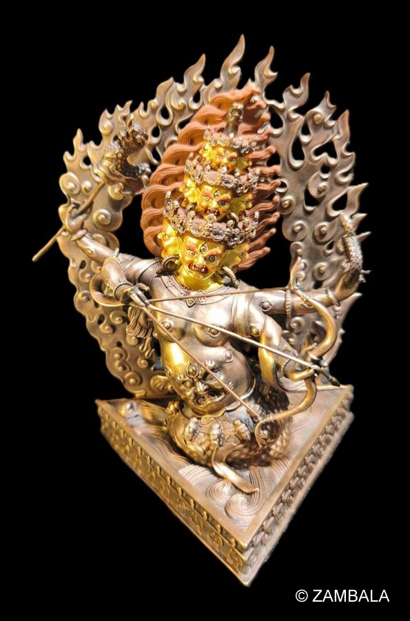 Rahula (Sanskrit: Rahula, also translated as Rahula, Rahula, or Rahu) is an important Dharma protector deity in Tibetan Buddhism, particularly central to the Nyingma (Red Sect) system. He is considered a wrathful wisdom protector, symbolizing the power to combat evil and subdue obstacles. Rahula is depicted as a nine-headed, eighteen-armed dragon, wearing a five-skull crown and a human or tiger skin skirt. He wields various ritual implements, such as a vajra, bow and arrow, and a skull staff. He resides in gloomy places such as the Sea of Blood or the Cemetery, accompanied by four dragon maidens. His name is derived from the original Sanskrit name, and should be chanted during rituals to ensure the invocation of his divine power.
