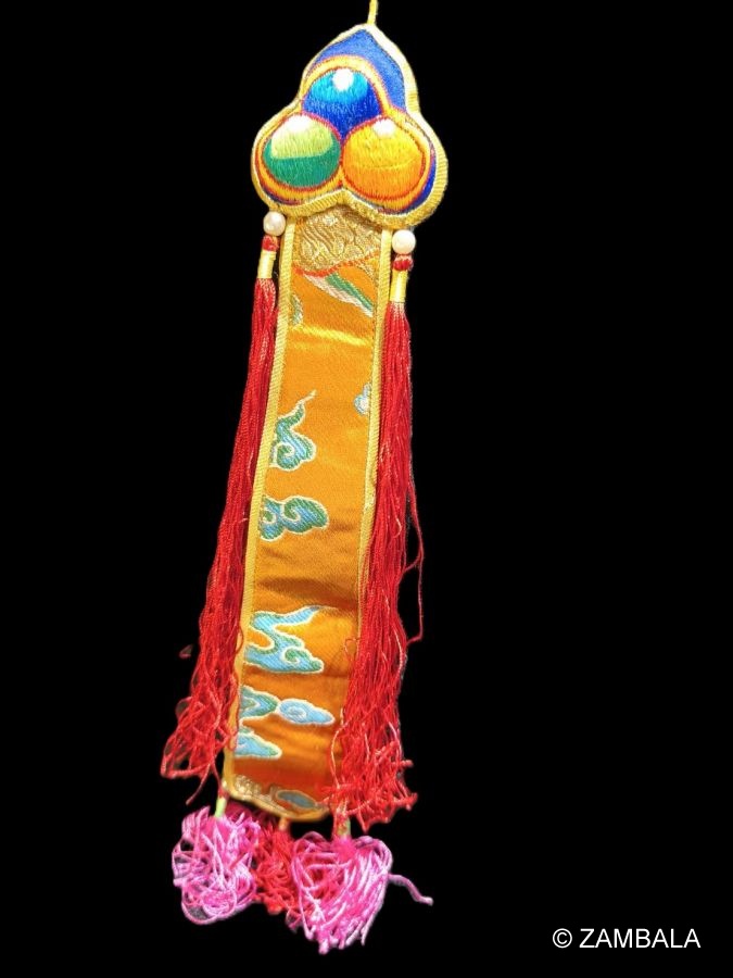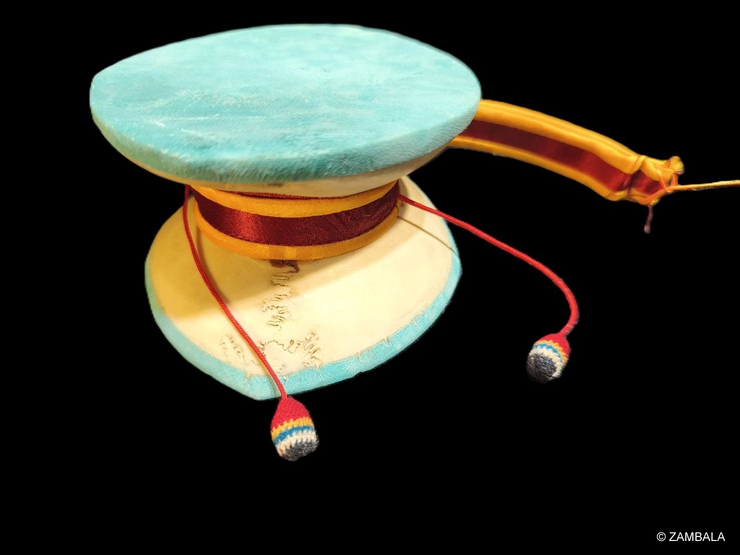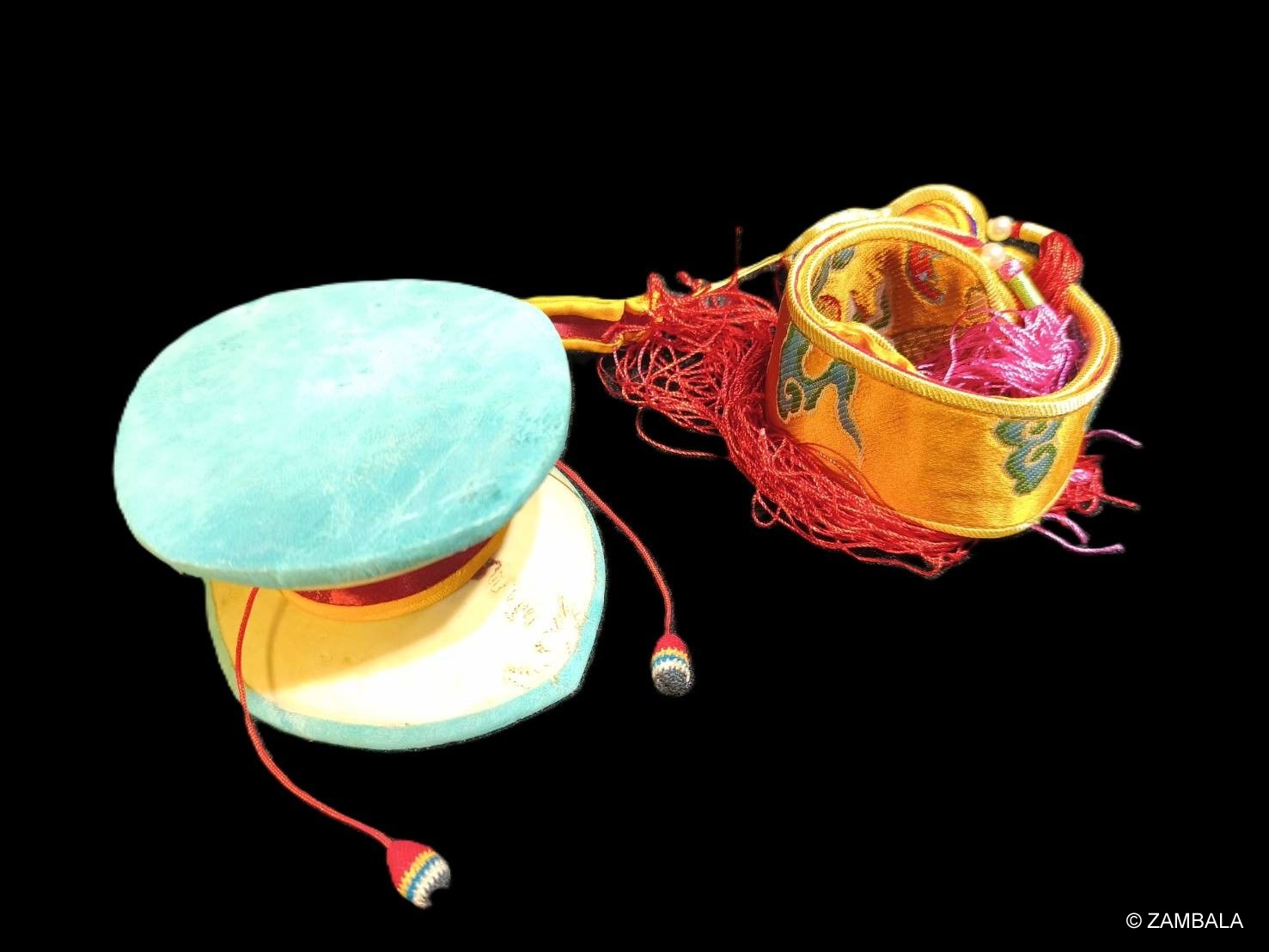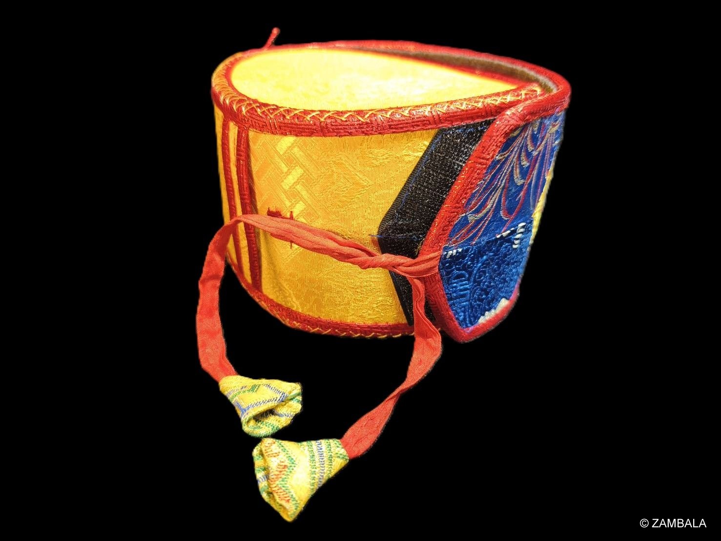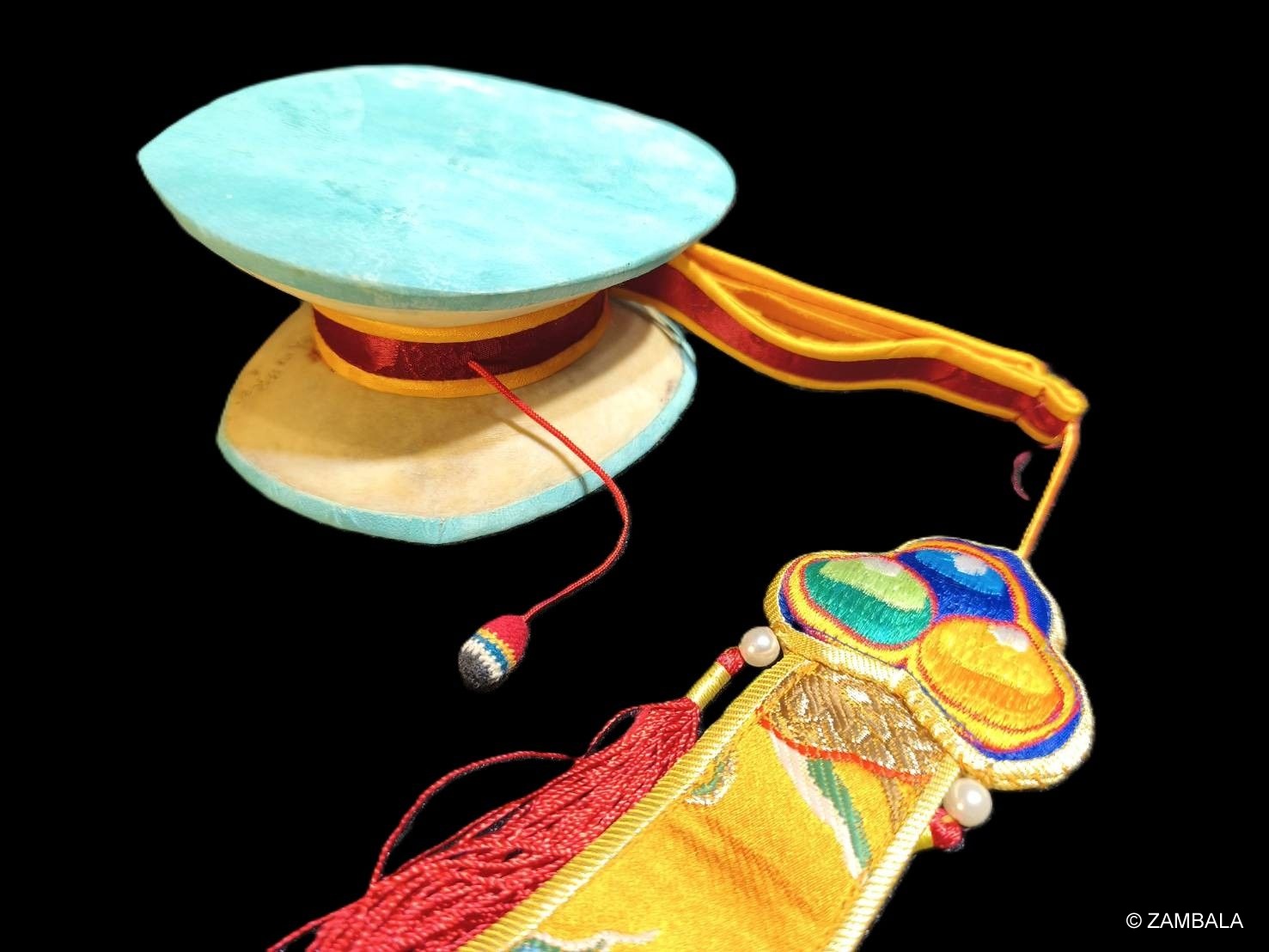 The kapala is also rich in symbolic meaning: the hollow cavity within the drum represents the dharmakaya (true nature); the drum skin symbolizes the unity of phenomena and emptiness; the striking ball represents the union of method and wisdom; the five-colored ribbon symbolizes the five Buddha families; and the sound represents the emptiness of the self, offerings to the deities, and the interdependence and selflessness of phenomena. It is seen as a microcosmic manifestation of the structure of the universe and all living things, encompassing Buddhist philosophy and meditation.