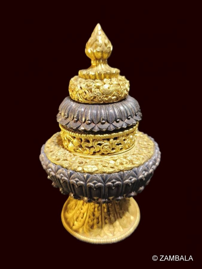 Rice containers are typically made of metal, such as copper or gilded metal, and may be engraved with mantras or Buddhist symbols to enhance their power. When used, practitioners place rice grains into the container and recite specific mantras, such as the "Transformation Mantra," imbuing the food with spiritual power so that it can reach all directions and benefit all beings.