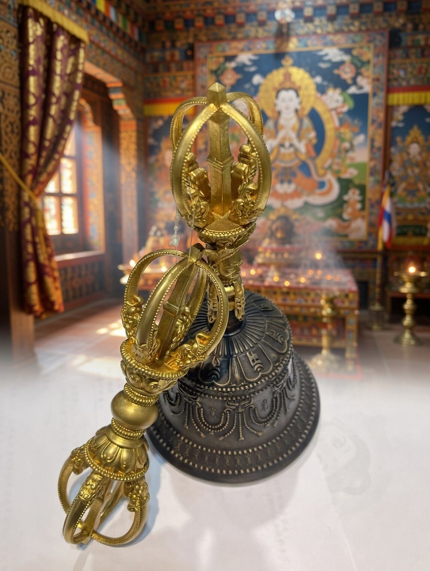 The union of the vajra (method/skillful means and active wisdom) and the bell (emptiness and ultimate wisdom) symbolizes the inseparability of wisdom and compassion, and the unity of method and emptiness—the core of the path to enlightenment.