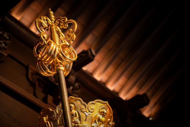 The origin of the tin staff is said to be that the Buddha allowed monks to make a staff that could make sounds in order to prevent monks from frightening donors or driving away poisonous insects when begging for food.