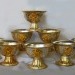 Offering Bowls (Ting) allow you to make a symbolic offering. The eight filled bowls represent an offering of drinking water, washing water, flowers, incense, light, perfume, food and music . The items represented come from Indian tradition. When a household invites a guest to a feast, the guest upon arriving will offer water for drinking. The guest will also wash their feet before entering the home. Then flowers and perfume are offered. Then before the feast candles are lit and then food is shared among all. In this way the water bowl offering is the sharing of the feast with all the Buddhas. Copper is the traditional material in which serving tools were made in ancient India. Here they are decorated with the auspicious symbols also .