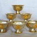 Offering Bowls (Ting) allow you to make a symbolic offering. The eight filled bowls represent an offering of drinking water, washing water, flowers, incense, light, perfume, food and music . The items represented come from Indian tradition. When a household invites a guest to a feast, the guest upon arriving will offer water for drinking. The guest will also wash their feet before entering the home. Then flowers and perfume are offered. Then before the feast candles are lit and then food is shared among all. In this way the water bowl offering is the sharing of the feast with all the Buddhas. Copper is the traditional material in which serving tools were made in ancient India. Here they are decorated with the auspicious symbols also .