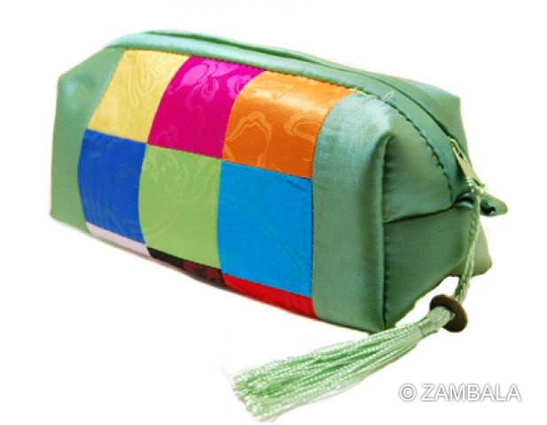 This stylish silk make-up bag also has a tassel and lucky coin on the end of the zipper. The base color varies from green, pink, blue and white. Please specify your preference.