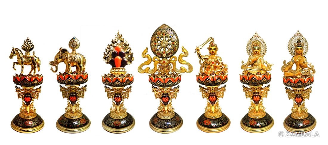 - **Mani Treasure**: A wish-fulfilling jewel emerged from the ground, capable of fulfilling all wishes. It symbolizes wealth and perfection. - **Queen Treasure (Jade Maiden)**: A beautiful and virtuous queen emerges from the palace to assist the king, representing harmony and compassion.