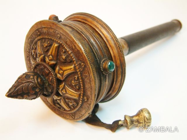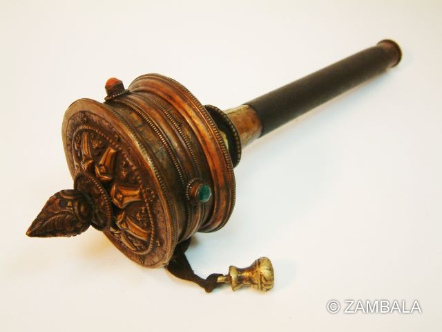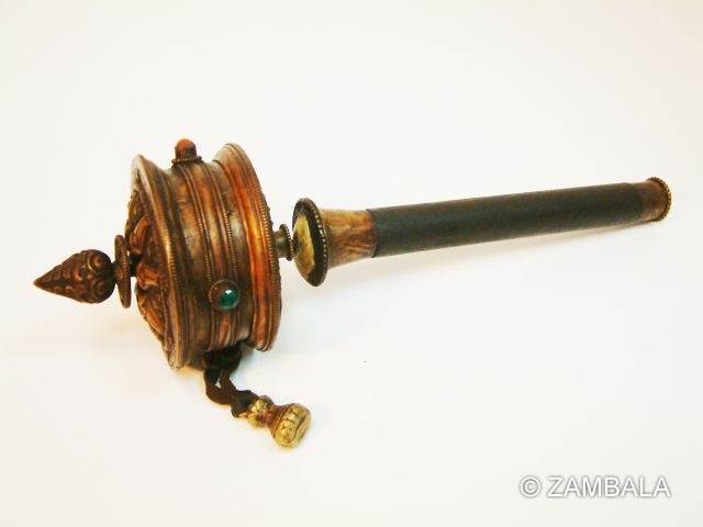 The hand-cranked prayer wheel is a very important and historical instrument in Tibetan Buddhism. The prayer wheel, also known as the "prayer cylinder", is called the "Mani prayer wheel" (མ་ནི་སྐུ་སྒྲུབ།, *mani khorlo*) in Tibetan. Its main purpose is to accumulate merit by chanting scriptures by turning the prayer wheel.