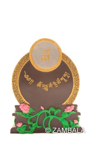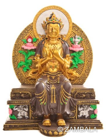 Maitreya Buddha hand painted on polyresin. The statue has individual seed syllable & heart mantra at the back; the bottom is hollow for statue consecration.