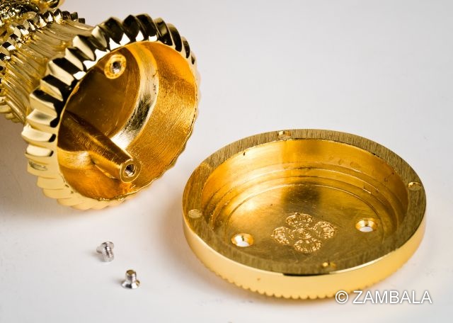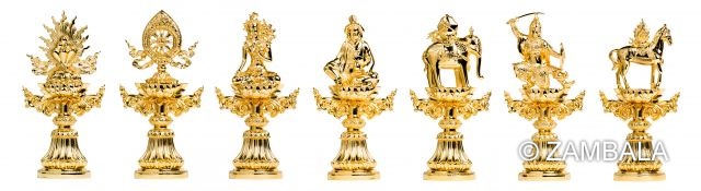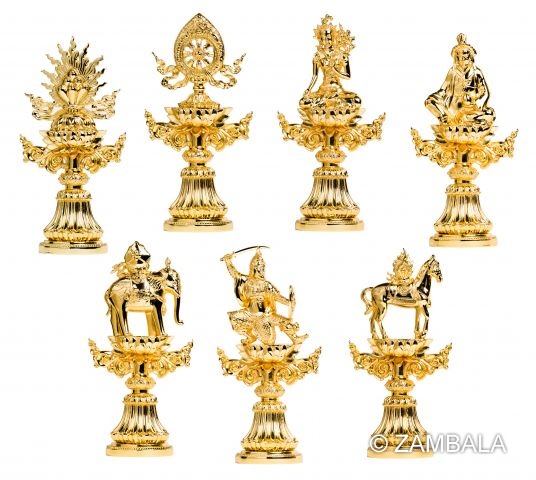 **Application in Offering Ritual**: The Seven Treasures are often placed on a mandala or altar as part of an offering, either in physical form or in symbolic form (such as metal or gemstone instruments). Practitioners express their devotion to the Dharma and their generosity by visualizing or physically placing these treasures. For example, in Tibetan Buddhist offering rituals, the Seven Treasures symbolize the Seven Factors of Enlightenment (the seven bodhi factors) of Dzogchen: investigation of the Dharma, equanimity, effort, rapture, mindfulness, concentration, and wisdom. These factors help overcome obstacles to practice and lead to enlightenment. This symbolic use is not limited to personal practice; it also occurs in temple ceremonies, initiation rituals, and festivals, reinforcing Buddhist concepts of kingship and the transmission of wisdom.