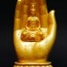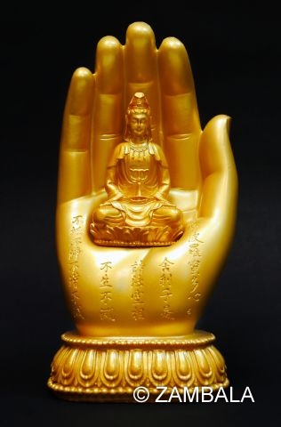Kuan Yin rests on a palm. Stands 7" tall. Kuan Yin statue separates and has magnet at base to keep it in place.