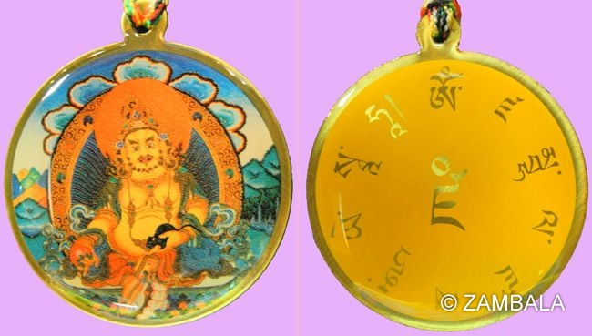 Zambala with Consort on the front and the mantra on the back of the pendant. Size: 1.25" diameter