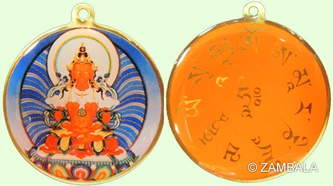 Amitayus with Consort on the front and the mantra on the back of the pendant. Size: 1.25" diameter