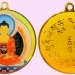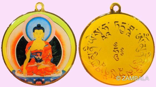 Sakyamuni Buddha with Consort on the front and the mantra on the back of the pendant. Size: 1.25" diameter