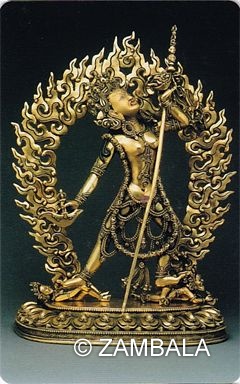 The body of Kaque Buddha is red, with one face, three eyes and two arms. She holds a hook knife in her right hand and a skull in her left hand. She is one of the important deities of Sakya tantra practice.