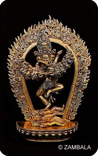 Hevajra is one of the five great Dharmas. Tibetan name "Jiduojie". Hevajra is blue in color, with eight faces and sixteen arms. The eight faces represent the eight liberations, and the sixteen faces represent the sixteen emptinesses. Each side has three red round eyes, with yellow hair flying upwards and a cross-shaped pestle on the top of the head. The sixteen arms all hold the Gaba skull vessel. He sits in a dancing posture on the lotus sun disc seat of four demons.