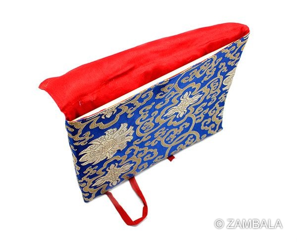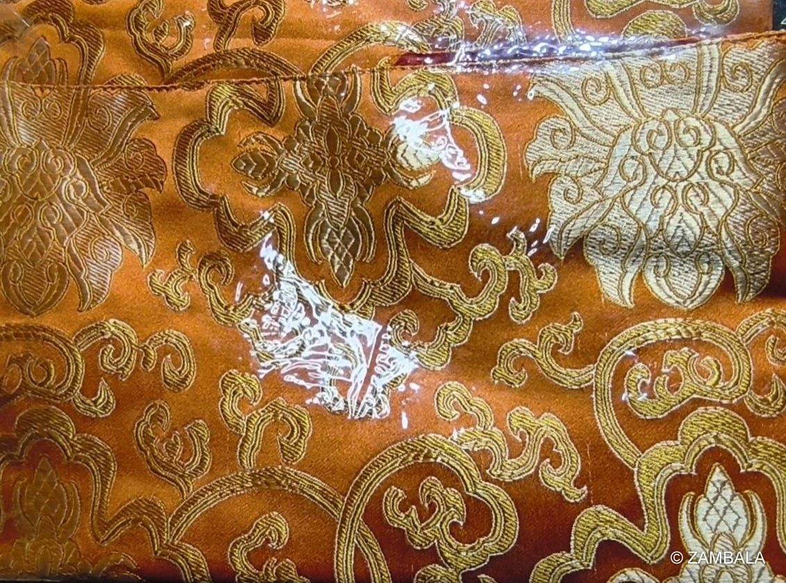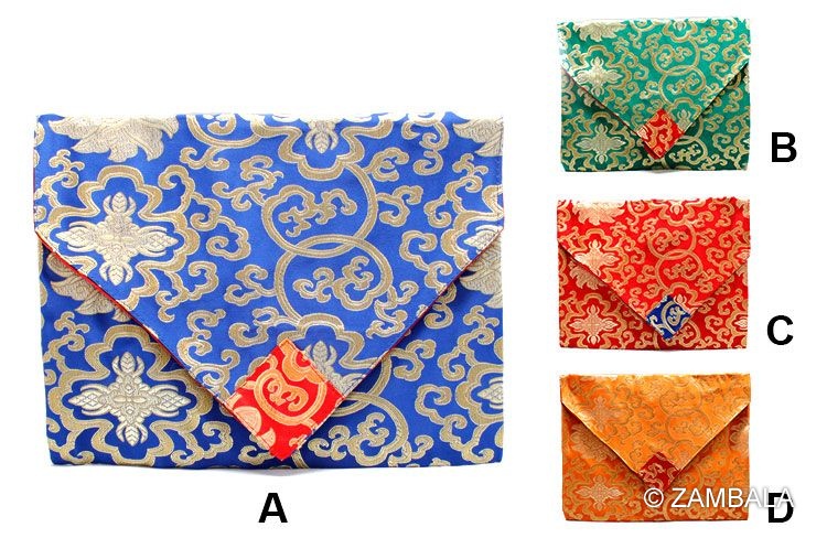 - Large monasteries' scriptures: Yellow satin, red satin, or gold-woven satin, embroidered with mandalas, the Eight Auspicious Symbols, and the Seven Treasures.