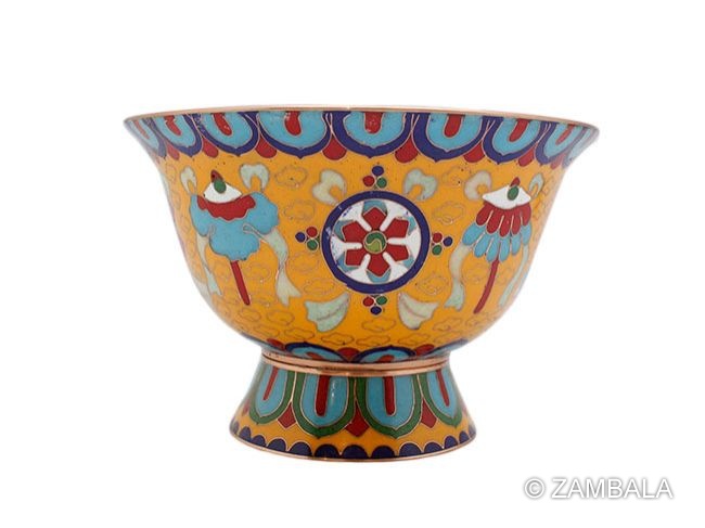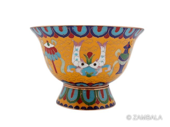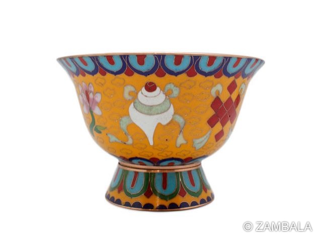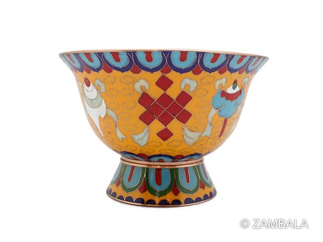 - **Status**: The Eight Offering Cup holds a crucial place in Tibetan Buddhist rituals, particularly in Tantric practice. The Eight Offerings must be placed before the mandala, and are considered essential for both home practice and temple ceremonies. Cloisonné Eight Offering Cups, known for their exquisite craftsmanship (copper filigree, enamel filling, and colorful designs such as the Eight Auspicious Symbols), are commonly found in high-end temples, palaces, and aristocratic altars, symbolizing a fusion of luxury and piety. Emperor Qianlong of the Qing Dynasty, known as the "Buddhist-minded Emperor," vigorously promoted cloisonné Buddhist artifacts, making them a symbol of the fusion of Tibetan Buddhism and Han culture, elevating the Eight Offering Cup's artistic and religious status.