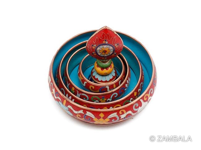 **How to Use a Mandala** A mandala typically consists of multiple layers of stacked boxes and a conch shell top. Each layer is hollow and can be filled with offerings such as gold, silver, gemstones, and grains. During practice, the practitioner recites mantras while scattering offerings into the mandala, stacking it layer by layer to the top, symbolizing wishes for auspiciousness and happiness.