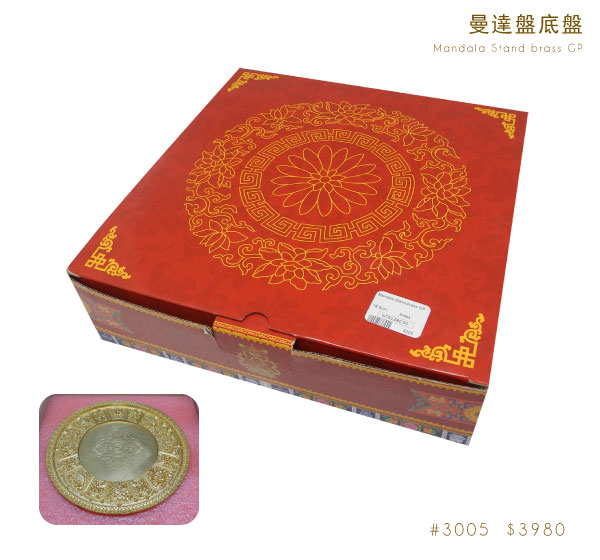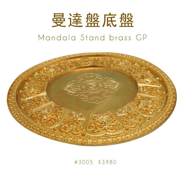 **Story of the Mandala Plate** The mandala plate symbolizes the center and edge of the universe, representing elements such as Mount Meru, the four continents, the sun, and the moon. Master Tsongkhapa (1357-1419) initially used stone slabs as mandala offerings. Later, mandala offerings were developed using materials such as gold, silver, and copper, and inlaid with jewels and jade for decoration.