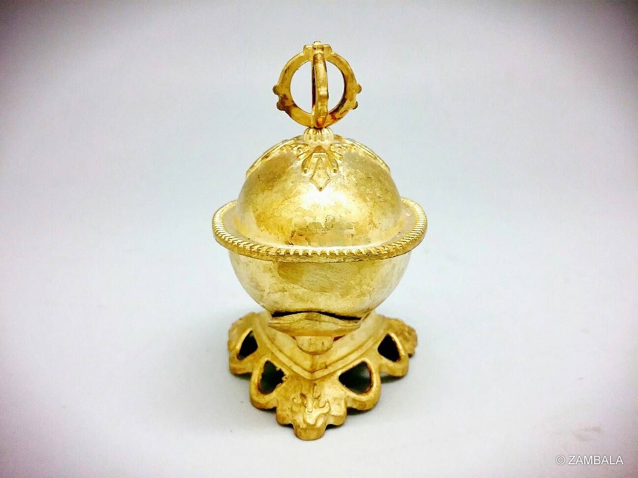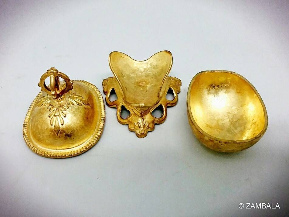 - The skull bowl is a silent skull bowl used for offerings and meditation; the Ghanta is a copper bell that sounds, symbolizing wisdom and the sound of the Dharma, marking ritual stages.