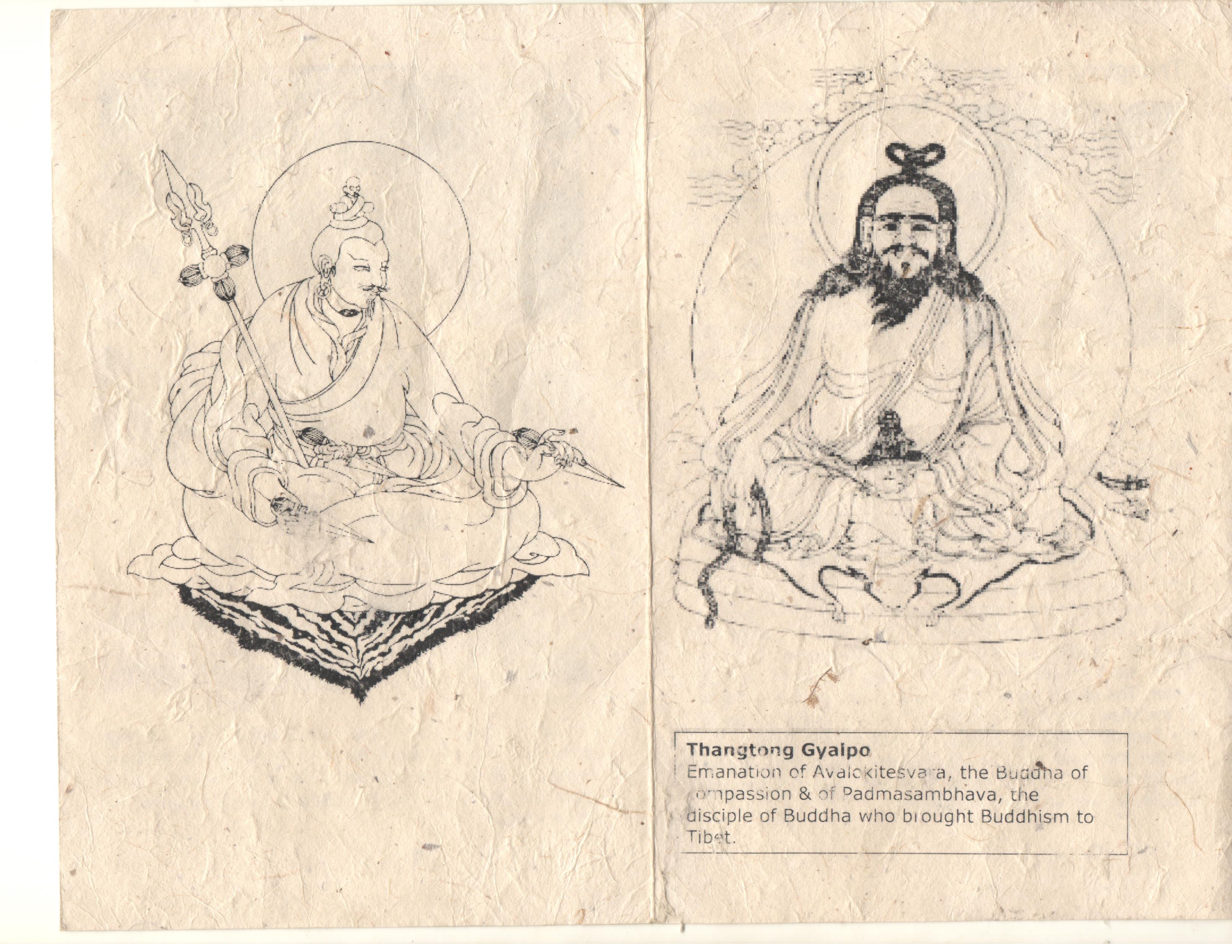 Emanation of Avalokitesavara, the Buddha of compassion and of Padmasmbhava , the disciple of Buddha who brought Buddhism to Tebet.