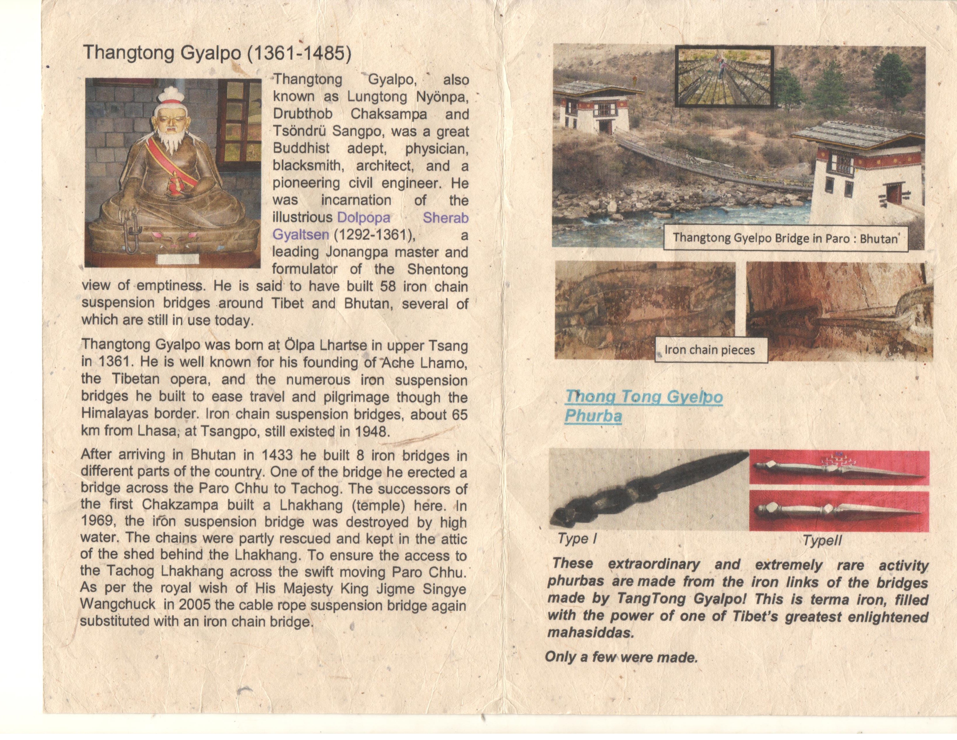 Thangtong Gyalpo was incarnation of the illustrious Dolpopa Sherab Gyaltsen (1292-1361), a leading Jonangpa master and formulator of the shentong view of emptiness. He is said to have built 58 iron chain suspension bridges around Tibet and Bhutan, several of which are still in use today.