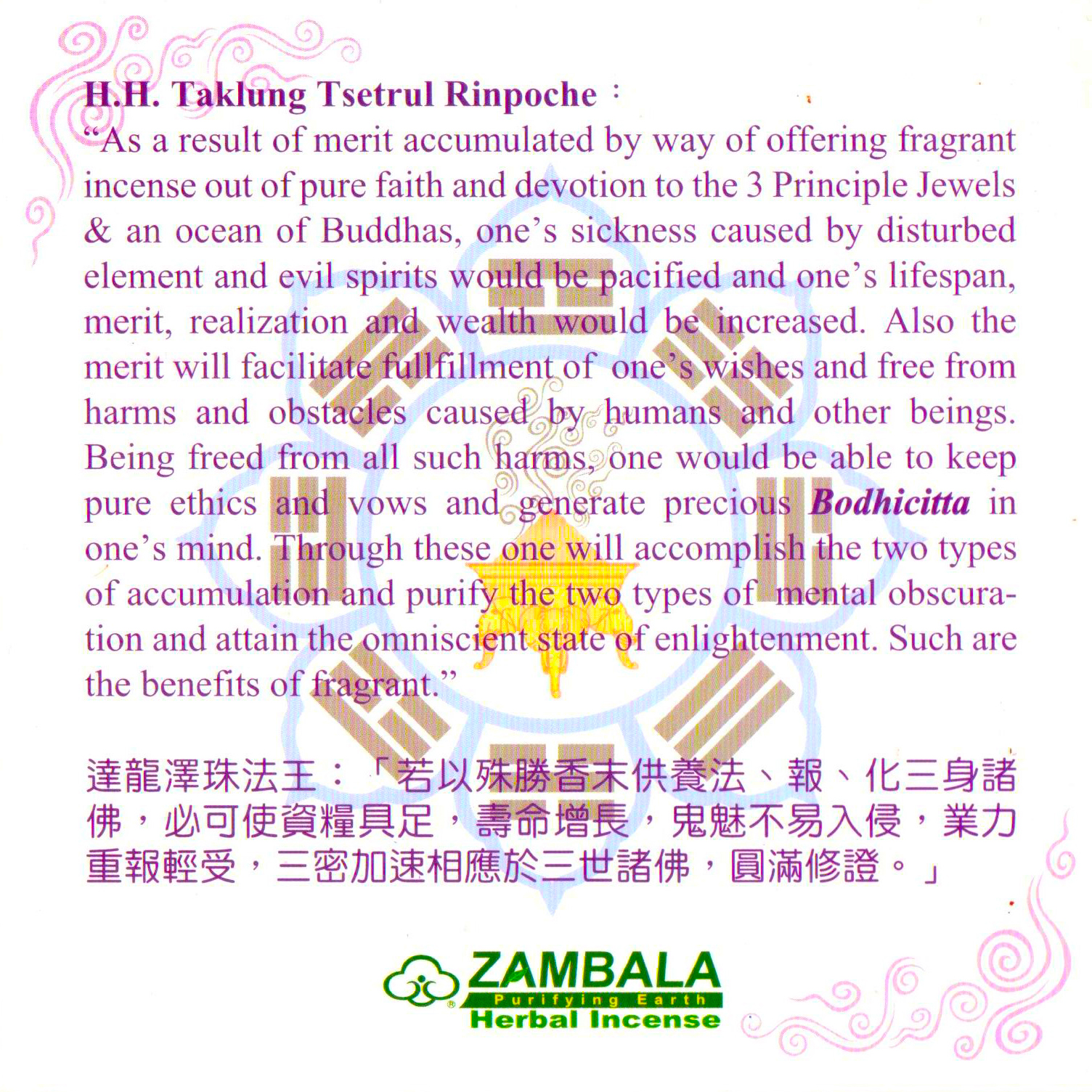 In the Chinese-speaking world, obstacle-removing incense became popular in the late 20th century with the eastward spread of Tibetan Buddhism. It is commonly found in spiritual communities in Taiwan and China, blending Han and Tibetan elements and used for daily prayers.