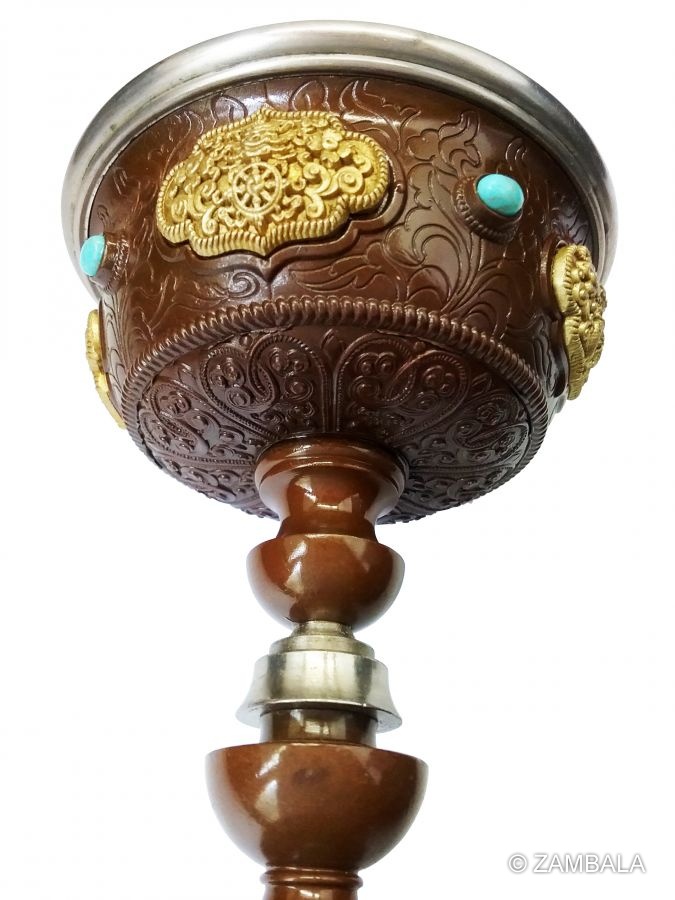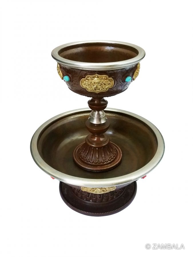 - The offering cup is usually a small container made of metal (such as copper, silver) or ceramics, mostly in the shape of a bowl or cup, with a simple design but sometimes engraved with auspicious patterns or mantras.