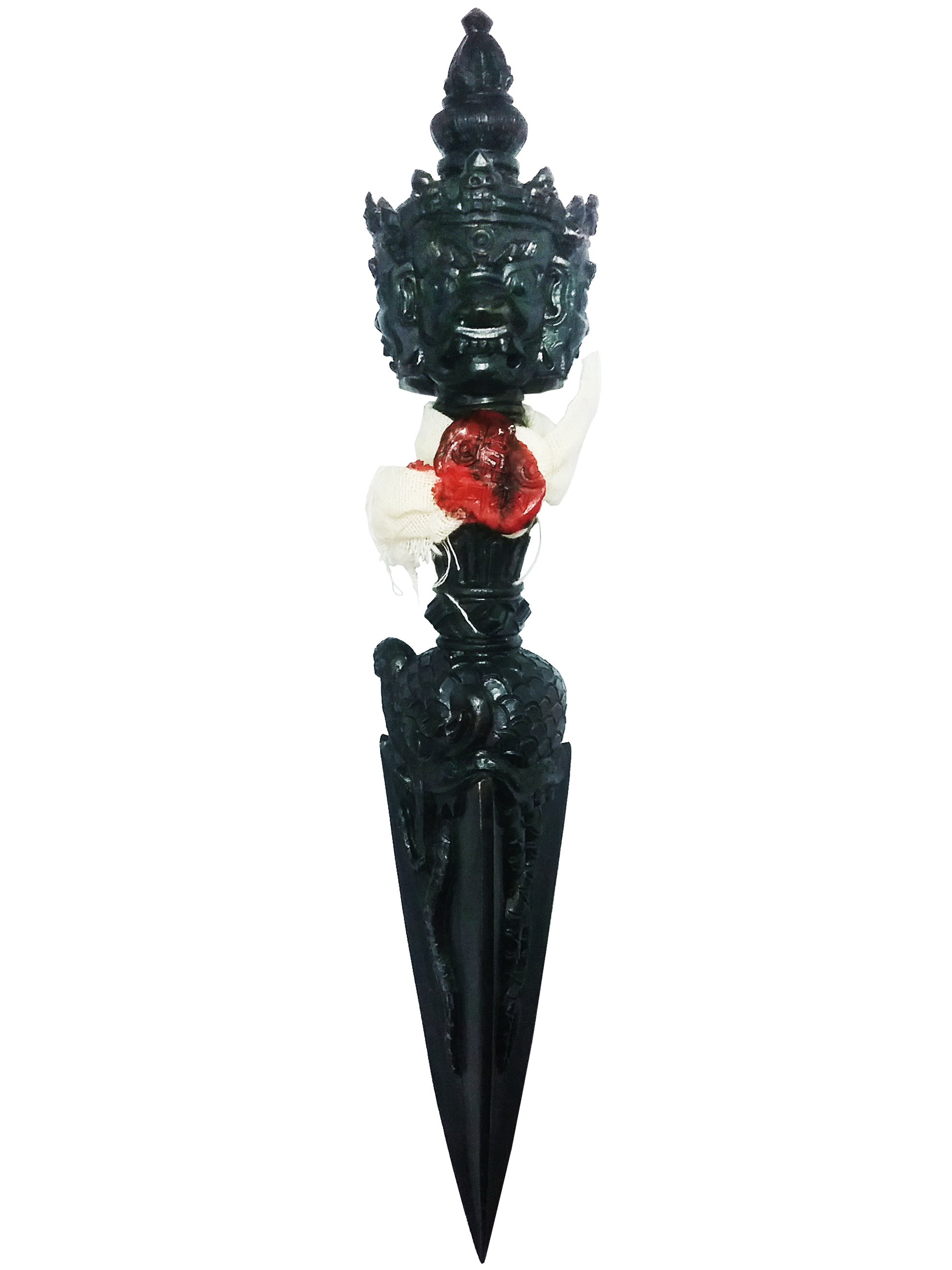The vajra prong was originally a cold weapon used by ancient Indians to break armor. It was later absorbed into Tibetan Buddhism as a magical weapon. It is made of copper, silver, wood, ivory and other materials. The appearance is similar, and they all have a sharp blade. However, the handles are decorated differently depending on their uses. Some handles are Buddha heads; others are statues of Guanyin Bodhisattva, wearing a five-skeleton crown and a horse head at the top. It means anger and subjugation. When practicing the Dharma, they are erected at the four corners of the mandala, which means that the area of the dojo is as solid as a diamond, and all kinds of demonic obstacles cannot harm it.