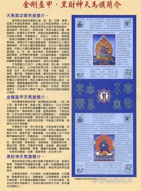 Prayer flags are printed with sacred images, prayers and mantras. It is said that wherever the wind that touches them goes, it will carry the beneficial power of the prayers to any beings it meeets. Prayer flags are used as a 'Feng Shuei' tool, they not only prevent the bad 'Chi 'but also transforms them into good and useful ones for the benefit of all sentient beings as and when wind and rain touches them. This Guru Vajrakila and Black Zambala Prayer Flag is specially designed for the person born in 'wood' year i.e. 'wood element' to accumulate more wealth and protection this two deities