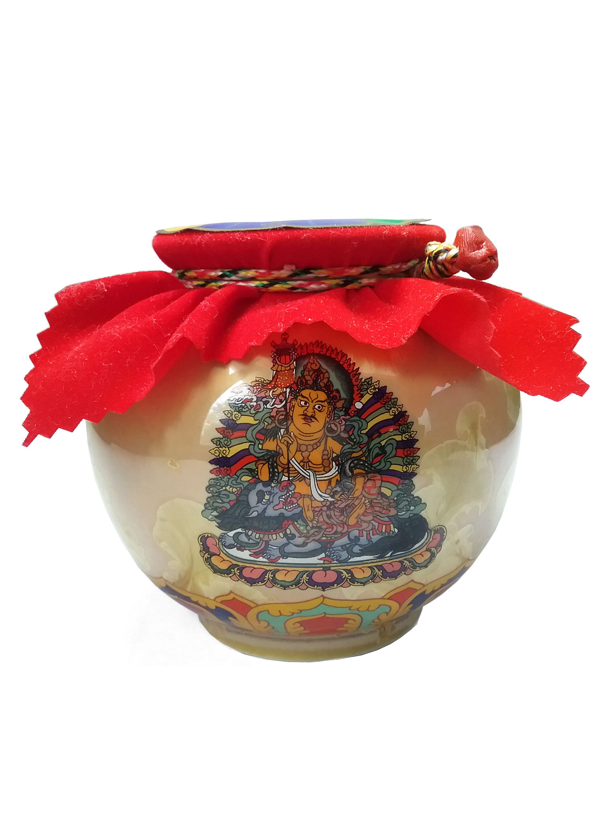 4. **Dharma Protector and God of Wealth**: The King of Treasures is enshrined as the main protector and god of wealth in Tibetan Buddhist temples. It is often seen in the stories of protecting and manifesting saints in the biographies of ancestors.