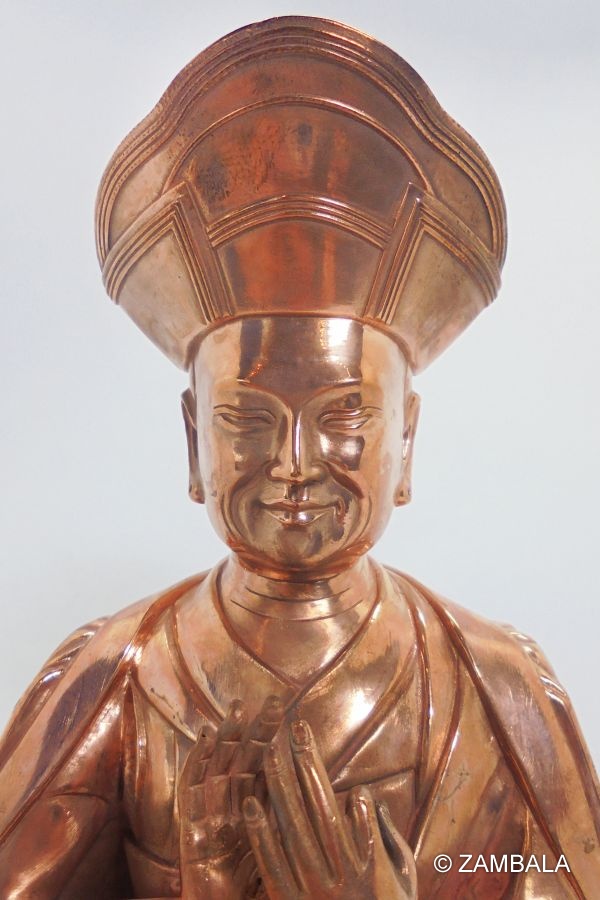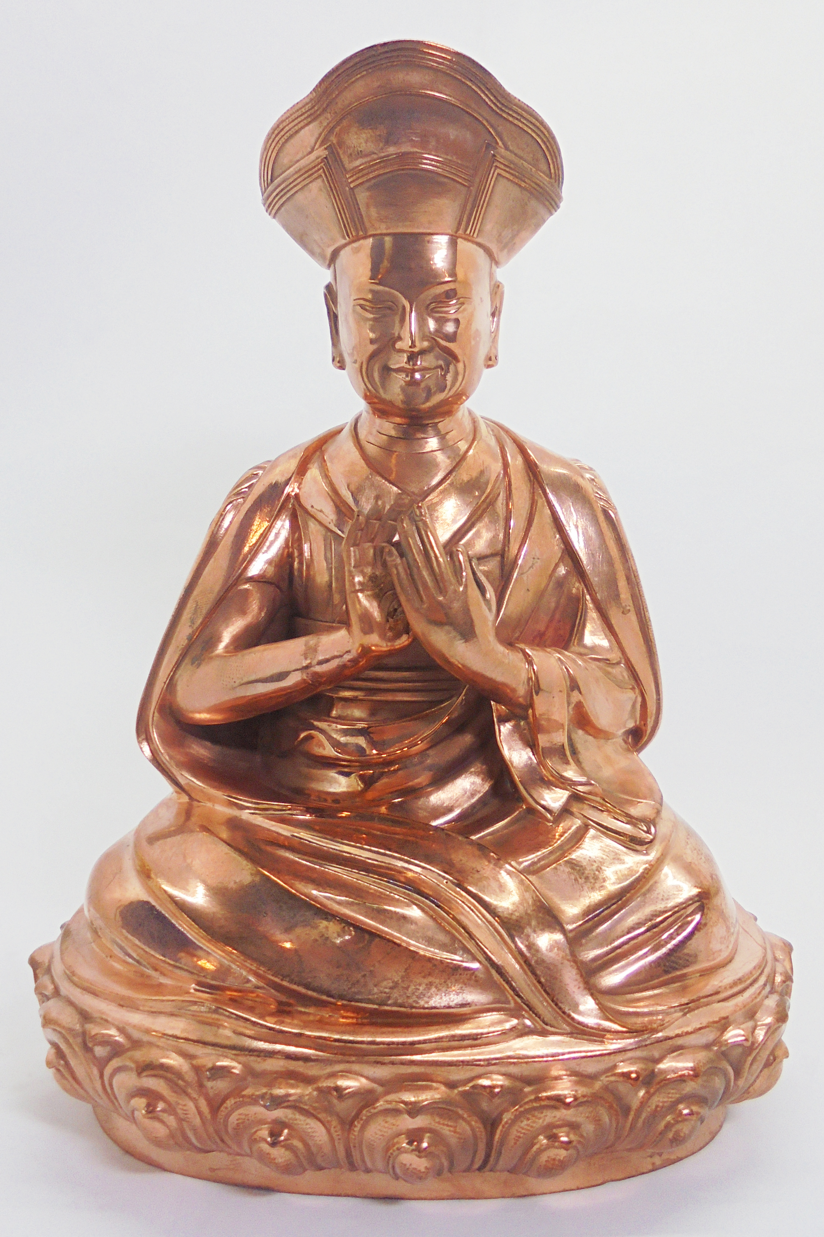 This precious image of the glorious Barompa Dharma Wangchuk brings liberation upon sight. It depicts the appearance of this holy being exactly as described in his Guru sadhanas. As well, it includes the features depicted on the first folio of an old edition of his collected songs. On February 19th, 2019—the fifteenth day of the Tibetan Month of Miracles, in Thimphu, the capital of the Buddhist country of Bhutan, the famous sculptor Karma la made the original mold of this image. Using it as the basis for casting, almost 21,000 of these precious images were created – pleasing to the sight and fields of merit for devotees. These are made of 97% copper. They also include gold, silver, iron, refined copper, and bronze – the five precious metals. In addition they include gold from the Jowo in Lhasa;old and sacred materials from the Tashi nbar image brought to Tibet from China by the Mahasiddha Karma Pakshi ; precious copper ore from Gegyal ; meteorite ; and iron from the chains used by the Mahasiddha Thangtong Gyalpo in building iron suspension bridges. Because they are made from so many rare and precious materials, needless to say, they can prevent all sorts of adversity. Especially, iron from the Mahasiddha Thangtong Gyalpo’s iron suspension bridges is renowned for protection from earthquakes and other harm caused by the disturbance of the four elements. These images, blazing with blessing, have been sponsored by hundreds of thousands of people who have faith in connection with the first program of the Barom Kagyu Association. May the goodness of their wondrous deeds so utterly pacify all sickness, famine, strife and other adversities throughout the world and bring all beings to enjoy lasting, glorious auspiciousness!