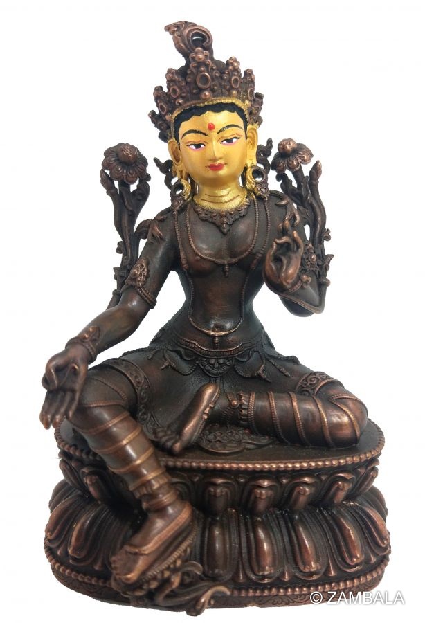 - **Sculptural Characteristics:** Green body, right leg hanging down (representing readiness to rise and save), left hand holding a blue lotus (symbolizing purification), right hand in the gesture of granting wishes. Commonly seen in Thangkas and Buddhist statues, influencing Nepalese, Mongolian, and Bhutanese art.