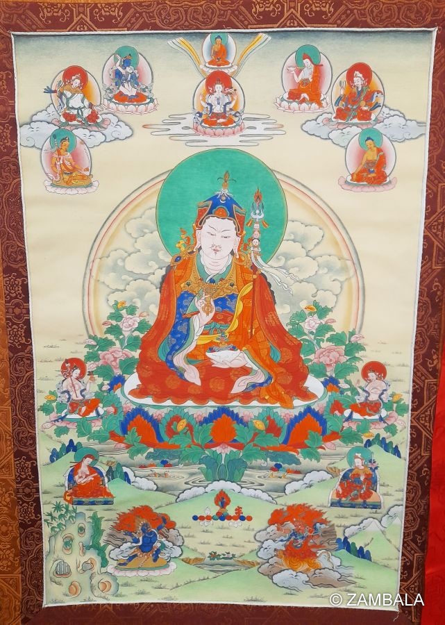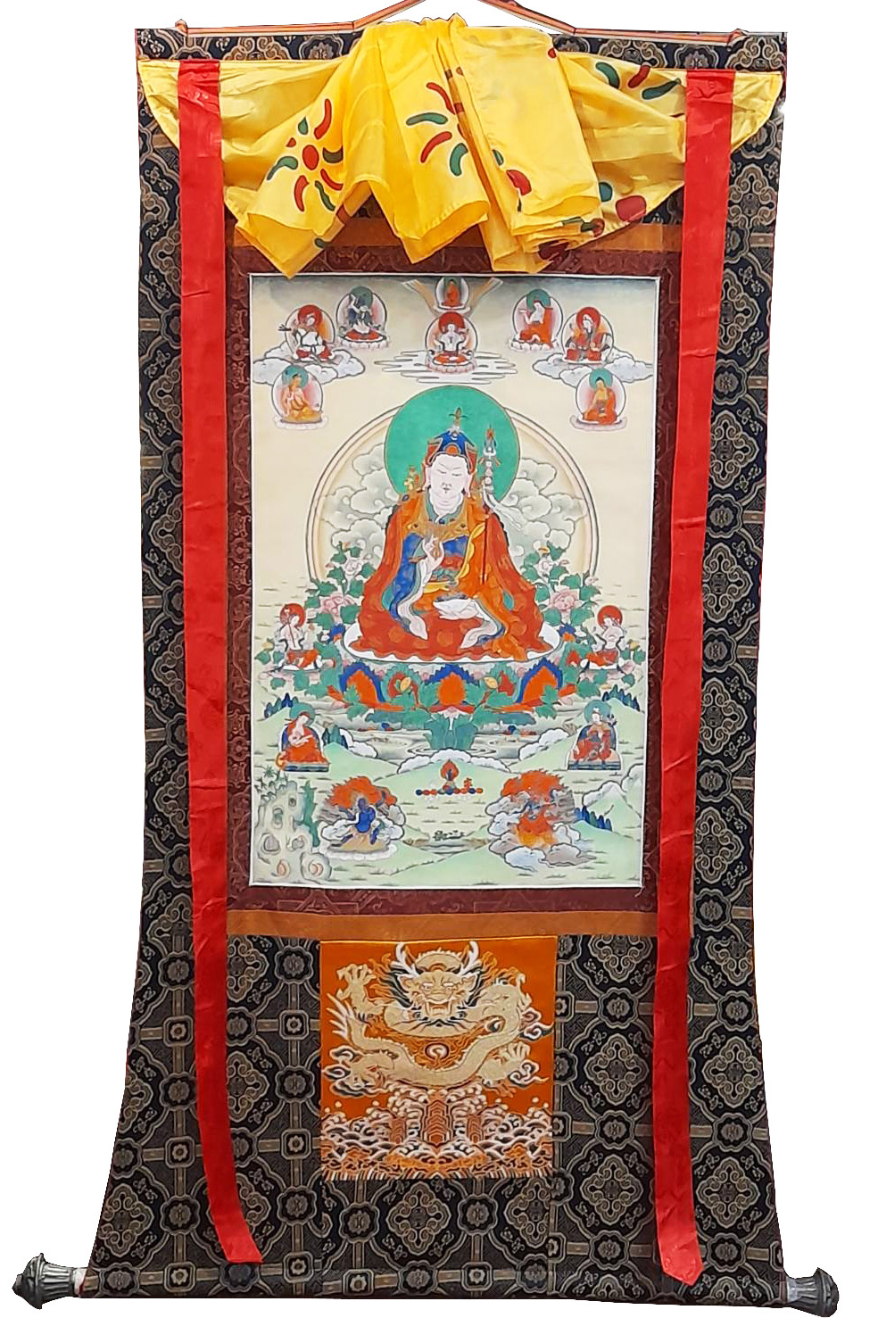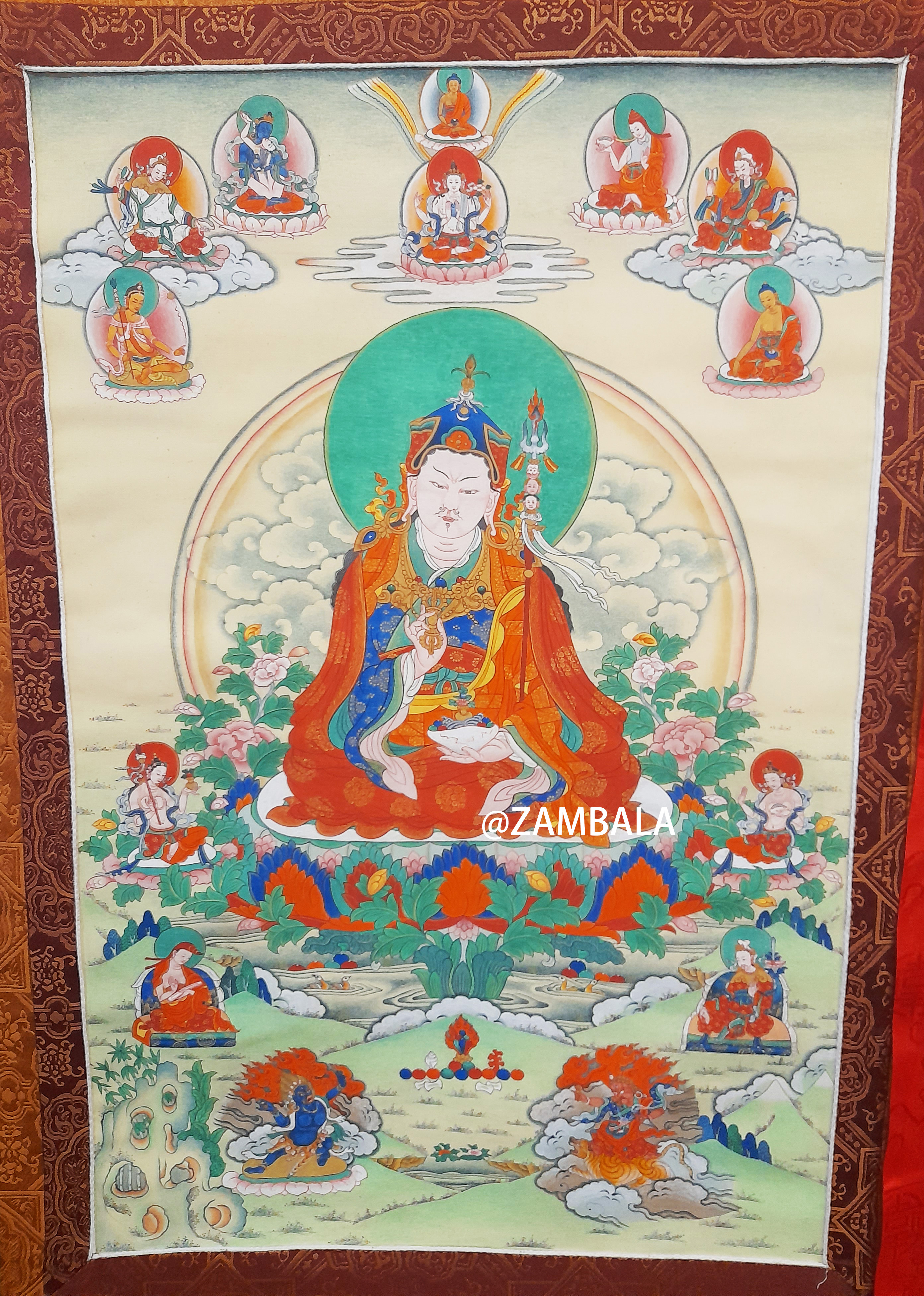 Guru Padmasambhava is revered as the "Second Buddha", second only to Sakyamuni Buddha, because he brought the Dharma from India to Tibet and founded the Tantric tradition of Tibetan Buddhism. He is regarded as the incarnation of Avalokiteshvara, embodying boundless compassion and guiding sentient beings out of the cycle of reincarnation. He is often depicted holding a vajra and a human bone bowl, wearing a lotus hat, symbolizing wisdom, compassion and Tantric power.