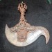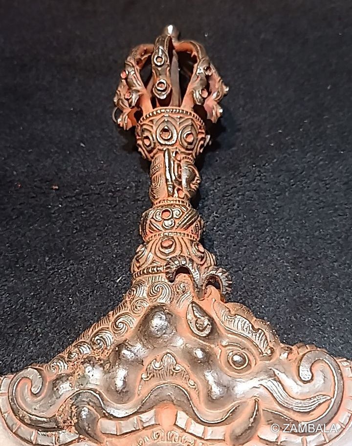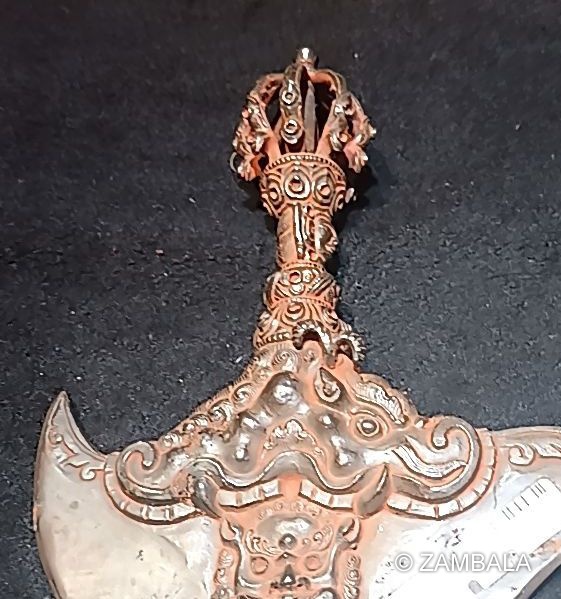 The handle is a vajra with a steel curved knife embedded underneath. Its meaning is to destroy all restraints.