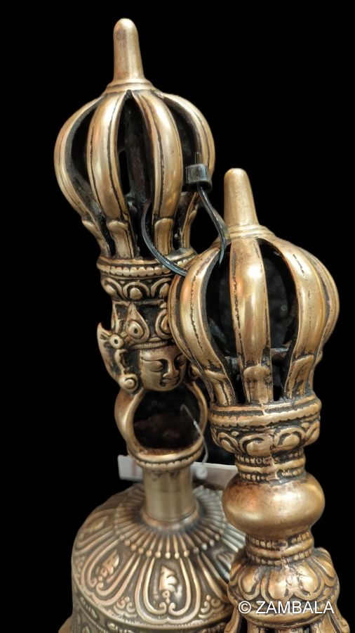 - The bell is wide at the base and narrow at the top, adorned with a small vajra (often nine-pronged) on top, containing a tongue. When shaken, it produces a clear, resonant sound. It symbolizes "prajna wisdom" (emptiness and the feminine principle), representing the Buddha's body (the upper part), the Buddha's speech (the sound), and the Buddha's heart (the vajra within the tongue).