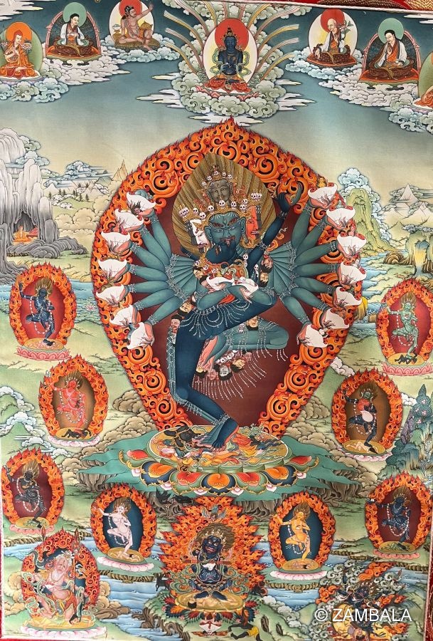 The main deity depicted in this thangka is a very important wrathful deity in the Tibetan Buddhist tantras, named Heruka (Tibetan: བདེ་བ་དང་ལྡན་པ།, transliterated: Deva Chinpa; Sanskrit: \*\*Śrī Cakrasaṃvara or **Śrī Heruka)**