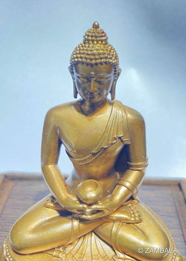 - In the Tibetan Buddhist Thangka art, Amitabha is often depicted as a red or golden body, sitting on a lotus seat, holding a bowl or making a concentration mudra, emitting light, and often accompanied by Avalokitesvara and Mahasthamaprapta.