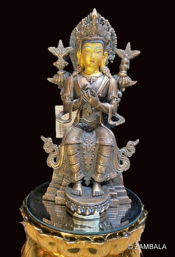 - Images of Maitreya Bodhisattva are prevalent in Tibetan Buddhist art, often found in temples, thangkas, and sculptures. He is typically depicted in a seated position (as a future Buddha at enlightenment) or a standing position (as a bodhisattva), wearing a crown or tiara and holding a Dharma instrument such as a water vase or a Dharma wheel, symbolizing wisdom and compassion.