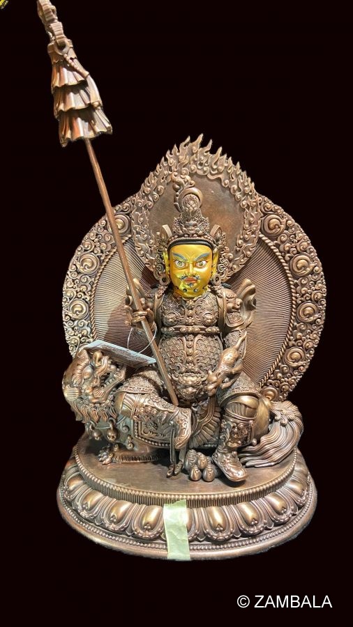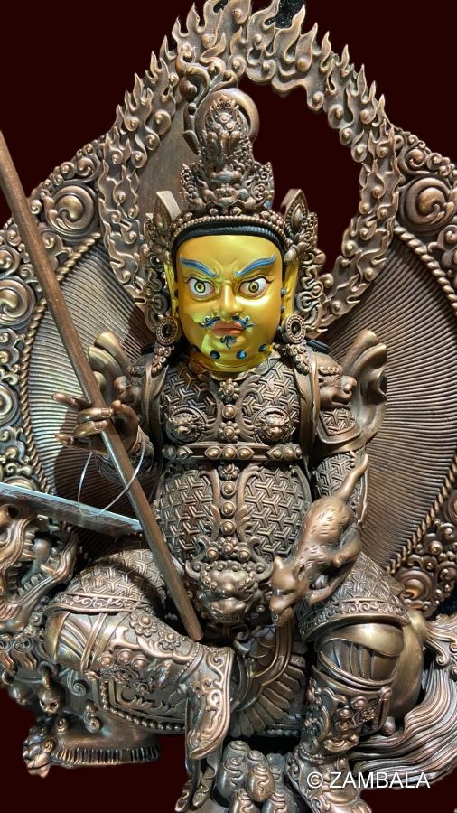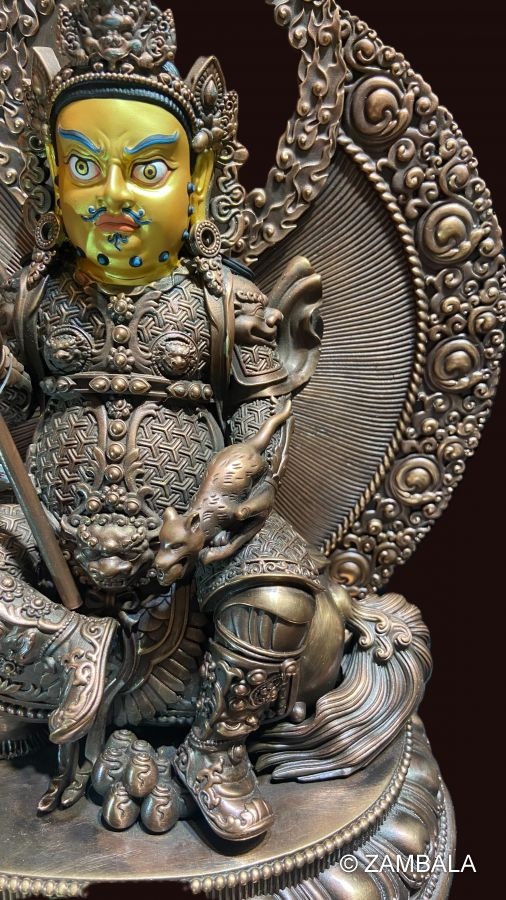 Treasure God (Sanskrit: Vaiśravaṇa, Tibetan: རྣམ་ཐོས་སྲས་, Namthöse), also known as Vaisravana or Vaiśravaṇa, is one of the Four Heavenly Kings in Buddhism, guarding the north. In Tibetan Buddhism, he is considered an important Dharma Protector and Deity of Wealth. He is typically depicted as a warrior riding a snow lion, holding a pagoda or a treasure-spitting rat, symbolizing protection and prosperity. His status is highly respected across all schools of Tibetan Buddhism, particularly within the Gelug school, where he is considered one of the three principal Dharma protectors, alongside Shadbhuja Mahakala and Yama Dharmaraja. He is responsible for protecting the Dharma, removing obstacles, and granting practitioners both material and spiritual prosperity. In the Tantric tradition of Tibetan Buddhism, influenced by Indian tantra, he is incorporated into complex ritual systems, symbolizing both inner wealth (spiritual freedom) and outer wealth (material prosperity).