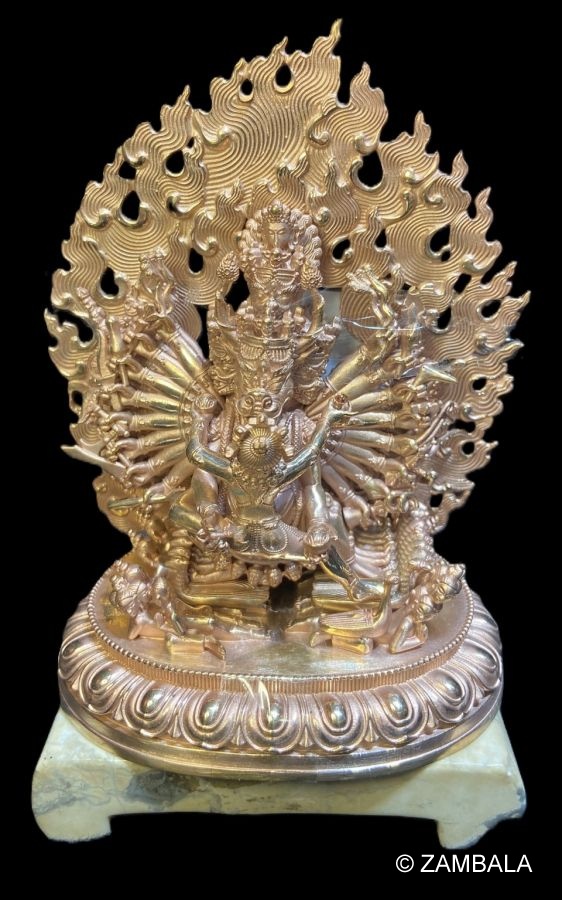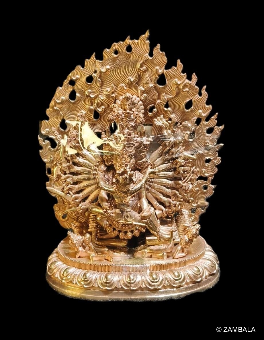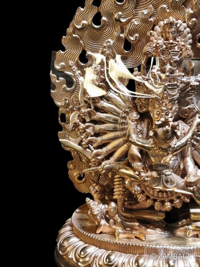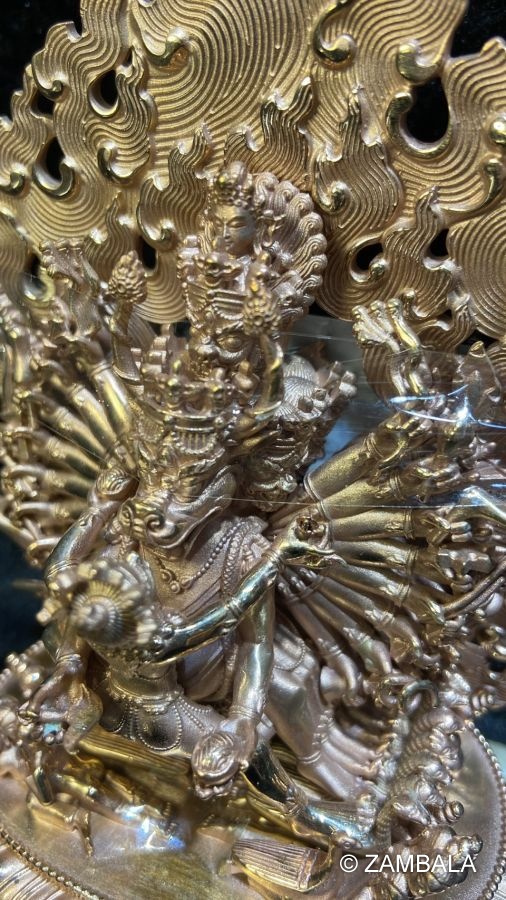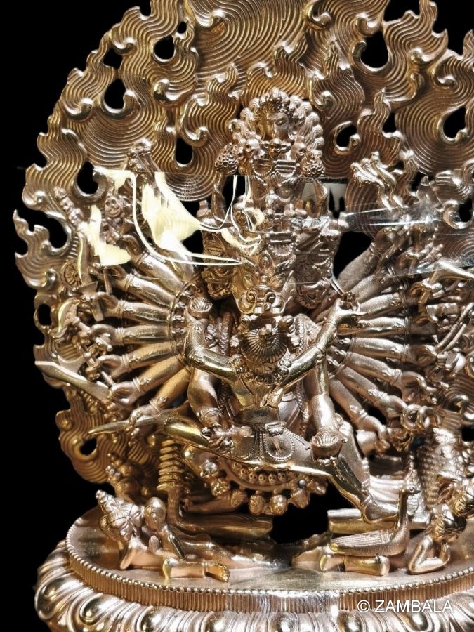 Its symbolism is rich: its typical image features a buffalo head (symbolizing the vanquishing of the god of death); it possesses multiple faces and arms (for example, a single deity has nine heads, 34 arms, and 16 legs, representing the nine categories of scriptures, the two truths, and the thirty-seven factors of enlightenment); it wields weapons such as a curved knife (to sever ignorance) and a skull cup (to restore vows); and its body is encircled by flames, symbolizing the fire of wisdom burning away defilements.
