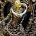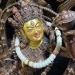 Material: Bronze. Cast. Gilded face. Base can hold sacred objects.