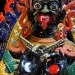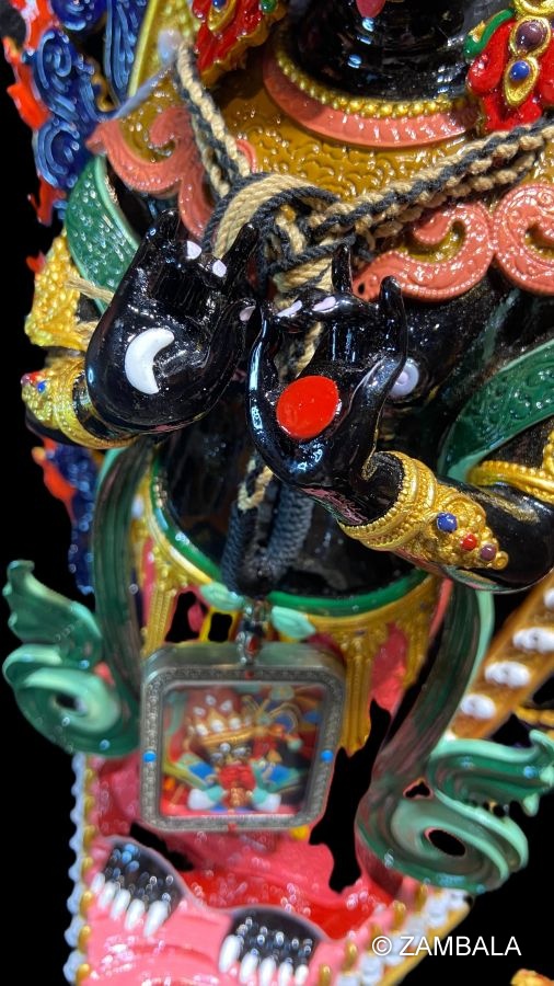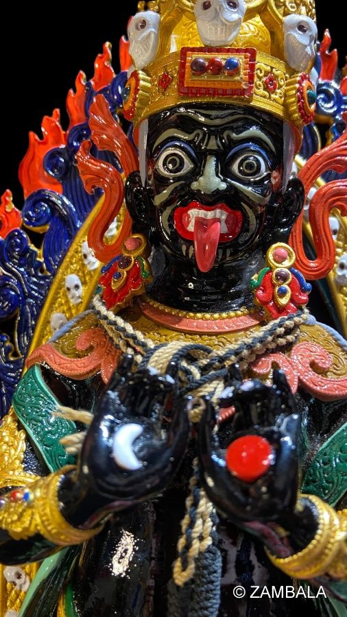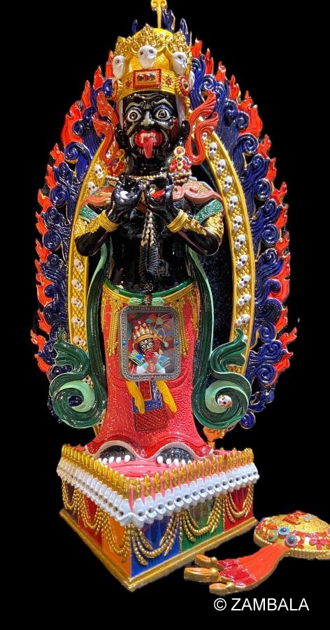 Zhaji Lhamo is a terrifying figure with a black face, a protruding tongue, a skull crown, and chicken feet, resembling the Hindu goddess Kali. She is dressed entirely in black, with bulging eyes, bared fangs, and a long, blood-red tongue. She wears a golden skull crown, and her lower body is shaped like chicken claws, with hands and feet attached to an iron chain.