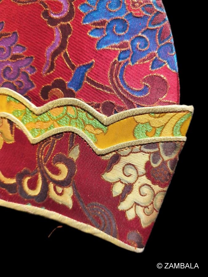 1. **Preparation Phase (Empowerment and Blessing): Before the ceremony, the crown must be empowered by a qualified lama (such as a Nyingma lama) in the presence of the remains of the Dzadrung. This includes chanting the Yogi Mantra, sprinkling pure water, and strengthening its protective power with a five-colored ribbon or gemstone. The crown consists of a blue base, five yellow upturned brims (symbolizing the five wisdoms), three embroidered eyes (awareness of all phenomena), a silver vajra (symbolizing indestructibility), metal disks of the sun and crescent (transcendence of time), and a mantra plate on the forehead (inscribed with the Mahakala mantra). The inner layer may be embroidered with a skull (recognizing death awakening), while the outer layer may be decorated with garudas or thunder dragons to harmonize wrathful and wisdom energies.